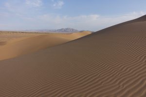 Auf der weiteren Route begegnen wir mehrfach weißen und braunen Kamelen. Sie sind hier meist unbegleitet unterwegs, tauchen aus dem Nichts auf und verschmelzen mit der Landschaft die an uns vorbeizieht. Am Nachmittag verlassen wir die Teerstraße und biegen zu den hier aufragenden Sanddünen ab. Peter reduziert die Luft in unseren Reifen auf unter 1 bar und dann beginnt der Fahrspaß. Er hat sichtlich Freude am Dünen-Surfen. Schon bald ist der perfekte Übernachtungsplatz gefunden. Selfie-Time! Nur dass uns dabei leider die Kamera nach vorne wegkippt und dabei jede Menge Sand frisst. Sie ist danach im wahrsten Sinne des Wortes zerknirscht, das Zoomen von unangenehmen Geräuschen begleitet. Wir erklimmen die Dünen und genießen den Sonnenuntergang. Heute kann nichts unsere gute Laune trüben, nicht einmal das Durcheinander aus Pistazien in Gurkensaft, das durch unsere Vorratskiste schwappt.