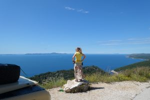 Nach endlosen Serpentinen bergauf und bergab – über mehrere Gebirgszüge – bei strömenden Regen, erreichen wir unerwartet die kroatische Küste. Von hier oben haben wir einen gigantischen Blick über das Meer und die schroffen Kalksteinberge die sich bis fast ans Ufer ziehen. Dazwischen Mittelmeervegetation mit Sträuchern und bunten Blumen. Und: Sonne!